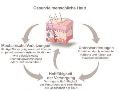 Die Hauptursache, von durch Ausscheidungen hervorgerufenen peristomalen Hautschäden ist der fortwährende Kontakt mit Stomaausscheidungen infolge einer Unterwanderung des Hautschutzes. Dies wiederum kann den sicheren Sitz Ihrer Versorgung erschweren. Wenn Ihr Versorgungssystem nicht gut um das Stoma sitzt, kann es wiederum zu Unterwanderungen kommen. Ebenfalls kann eingeschränkte Haftung zu weiteren Unterwanderungen und Hautschäden führen. Bei einer schlechten Haftung kann ein häufigerer Versorgungswechsel vonnöten sein und dadurch zu Hautschäden wie Hautrissen führen. Dieser „Teufelskreis“, ist vor allem bei schwereren PHKs schwieriger zu beheben.