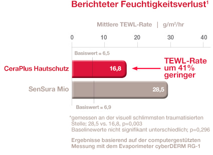 Der transepidermale Wasserverlust (TEWL) war 41% geringer mit dem CeraPlus Hautschutz gegenüber dem SenSura Mio Hautschutz.1